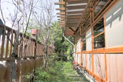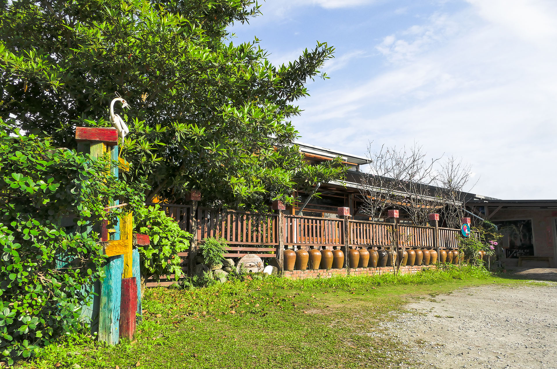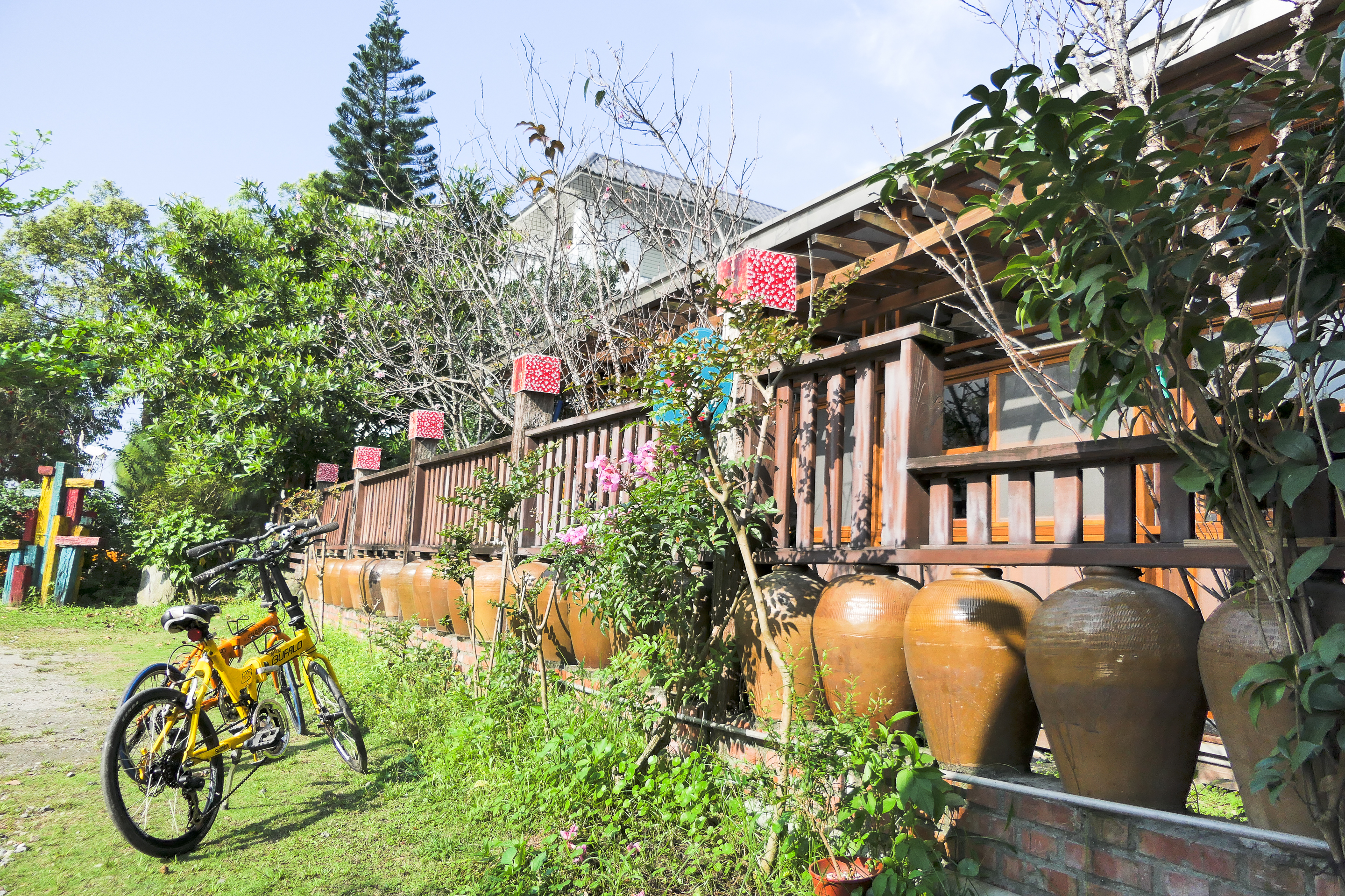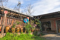 櫻の田野民宿區在櫻の田野大門左側。古色古香的老酒甕末端就是民宿入口。